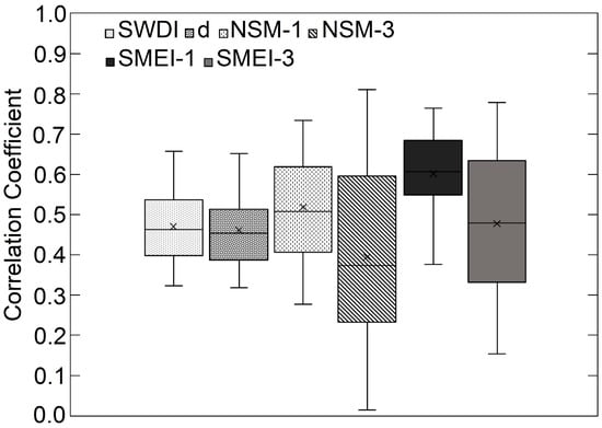 To help facilitate a better comparison between new and previously developed SM indices, box and whisker plots of their correlation coefficients with all meteorological indices at all sites are shown in Figure 4. The average correlation between SMEI and meteorological drought indices was 1.3 times higher in comparison to existing SM indices. The SMEI-1 had the largest mean r (0.60) among all SM indices followed by NSM-1 with 0.52. The SMEI-1 also had one of the smallest ranges (0.37–0.76), indicating relatively better performance under variable climatic conditions. In general, the r values had a larger range for longer time scales such as NSM-3 and SMEI-3. This was expected, since indices estimated on a scale of three months are likely to be more strongly correlated with medium to long-term meteorological drought indices but not with short-term indices.