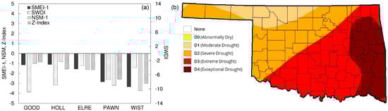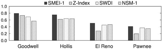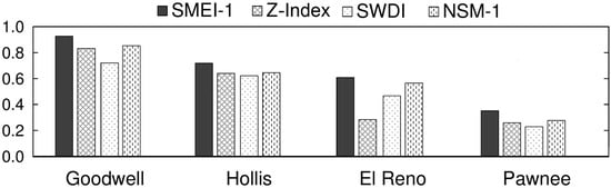Two drought episodes in February 2006 and July 2011 were selected to investigate spatial variability in drought indices. The corresponding USDM maps were used in the analysis. According to Oklahoma Water Resources Board [66], the period of September 2005 to March 2006 was the driest cool growing season in Oklahoma since 1921. The departure from the normal precipitation during this season ranged from −366 mm for the Southeast division (Wister) to −105 mm for the Panhandle region (Goodwell), and the severity of drought gradually reduced from east to west. In February 2006, Wister and Pawnee were under D4 and D3 categories, respectively. The remaining sites were facing D2 category. The spatial variability of SMEI-1 was in agreement with USDM (Figure 6), ranging from −3.34 at Wister to −1.14 at Goodwell. NSM and Z-Index also showed a similar pattern. However, SWDI had a nearly opposite trend, showing an increase in drought severity from east to west. This was most probably because this index is solely based on soil moisture availability in the root zone and does not include other parameters. In addition, it is not normalized based on the past data at each site. Despite having smaller departures of soil moisture from average, the magnitude of soil moisture was smaller in western sites compared to eastern ones due to their natural aridity. Hence, SWDI signaled a more severe drought. Keyantash and Dracup [23] mentioned that indices that are normalized are more appropriate for comparing across locations.