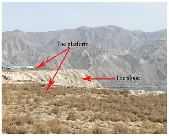 The South Jingyang Platform is located between the city of Xianyang and Jingyang country, with an area of about 70 km2. The elevation difference between the top and bottom of the platform varies from about 50 to 100 m and its slope ranges from 40° to 90° (Figure 1). The angle of the upper part of the slope is approximately 60° with a height difference of 10–15 m and the angle of the lower slope is approximately 50° with a height difference of 40–80 m. Malan loess (Q3 loess) and Lishi loess (Q2 loess) are the main constituents of the carcass. In the study area, the typical loess irrigated area of Shutangwang Village was selected (the geographical coordinates are 108.84° E, 34.49° N) for the field irrigation infiltration test and the acquisition of the indoor experiment soil samples.