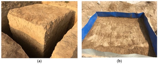 The purpose of this field experiment was to observe the water infiltration process under the irrigation condition. As shown in Figure 2a, we manually excavated the soil column with 200 cm in both length and width and 255 cm in height, sealed the surrounding of the soil column with bentonite and wrapped plastic film around the soil. One vertical side of the soil column was left uncovered to embed the sensors. The soil column was combined with two different soils, the upper 105 cm Q3 loess and the lower 150 cm S1 palaeosol. As shown in Figure 3, 8 Time-Domain Reflectometry (TDR)-3 moisture sensors were embedded along the depth of the soil column and the corresponding depth was 15 cm, 45 cm, 75 cm, 105 cm, 135 cm, 165 cm, 195 cm, 225 cm from the top surface of the soil column. We connected the installed sensors to the CR3000 data logger, backfilled the sensor holes with bentonite, and finally sealed the boundary with bentonite. Figure 2b shows a water retaining plate arranged above the soil column to provide a 6 cm constant head boundary condition during the irrigation process. The data logger acquisition interval was 3 min in order to achieve continuous, real-time observations of the entire process of irrigation. The irrigation test stopped when the moisture sensor at the 2.25 m depth responded, which happened after 58.65 h.