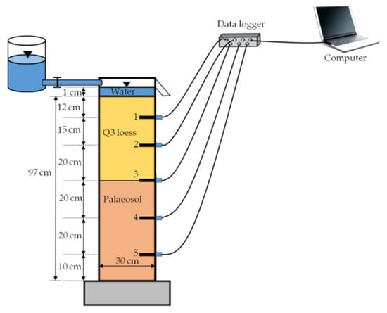 We removed 3 cm of soil from the top of the column, leaving 47 cm of loess and 50 cm of palaeosol, to eliminate the influence of the disturbed soil. In addition, a sheet of filter paper and a permeable stone were placed at the bottom of the soil column. Afterwards, the soil column was placed on the base, which had a hole in the centre for water drainage or air expulsion. We sealed the gap between the side wall of the PVC cylinder and the base with glass glue to ensure that no water flowed out from here during the test. As shown in Figure 4, the soil column was equipped with five tensiometers (T1 to T5), installed at the corresponding reserved holes 12, 27, 47, 67, and 87 cm from the top of the soil column, respectively. A sheet of filter paper was placed on the top of the soil specimen to avoid disturbing the soil sample during the test. The water supply container was connected and an overflow hole was provided 2 cm from the top of the PVC cylinder to maintain a 1 cm constant water head. The tensiometers were connected to the CR3000 data logger and we observed the corresponding readings using a computer to judge whether the test device was normal. The data acquisition interval was 1 min. The experiment ended when the response of the fifth tensiometer was terminated, which was after 575 min. All sensors responded well.