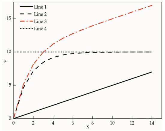 As can be seen from Figure 6, Line 1 is a linear model and Line 2 is a nonlinear model. Line 3 is a superposition model of Line 1 and Line 2, and Line 4 is an asymptote of Line 2. The model form of Line 2 is: