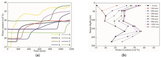Figure 7a shows that soil water content at the position of moisture sensors 1–8 changed with the irrigation time. The variation in soil water content experienced four stages: stable state, sharply rising state, slowly rising, and stable state again. Figure 7b shows that when the saturated zone of the loess reached a certain depth, it would not move down. The water migrated downward in the unsaturated state in the soil, so the actual migration form of water in the loess was dominated by unsaturated forms. At the same time, Figure 7 and Table 2 demonstrate that the water content of the palaeosol was significantly greater than that of the loess, which could be explained by the high content of clay in palaeosol soil. This is consistent with the conclusion in []. Figure 7b shows that the water content above and below the position of sensor 4 was discontinuous. From the perspective of energy, when the water moves from one layer to another, the water potential at the interface should be continuous, inevitably causing the soil moisture in the upper and lower layers of the interface to be discontinuous.