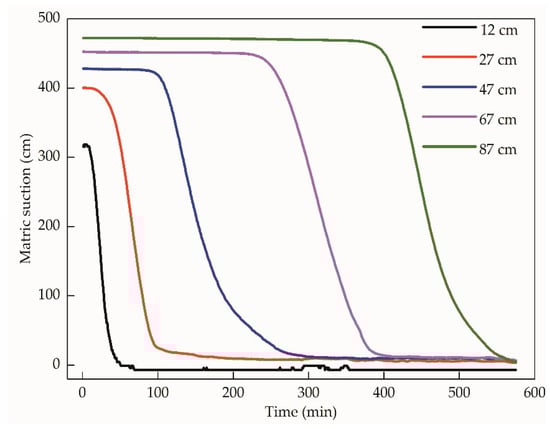 As we can see from Figure 8, the changes in the matric suction were divided into three stages, as follows: stable before the wetting front arrived, sharply decreasing when the wetting front arrived, and basically stable after a period of time. The matric suction values were relatively high for all sensors during the initial stage of the infiltration. When the wetting front arrived, the infiltration capacity of the soil was high and the matric suction rapidly decreased. As time passed, the decreasing rate of the matric suction slowed. After a certain period of time, the soil matric suction was stable. Comparatively speaking, the closer the tensiometer was to the top surface, the faster the suction changed. It can be seen from the figure that the migration velocity of the wetting front below 47 cm was significantly slowed down, which indicates that the infiltration rate of water in the lower layer of palaeosol was reduced.