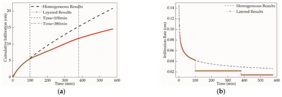 The variation in soil infiltration rate with time is shown in Figure 9b. The infiltration rate of the layered soil was the same as that of the homogeneous soil before the wetting front reached the lower layer. After the wetting front entered the lower layer, the infiltration rate became constant, that is, the infiltration turned into a stable process. There were two different linear parts, 0.0221 cm/min and 0.0145 cm/min, meaning that the infiltration rate reduced again at t = 380 min when the wetting front reached the fifth sensor, for the reason that the palaeosol under the fifth sensor had many calcareous concretions and stronger water resistance. According to the variation characteristics of the infiltration rate, the whole infiltration process of the layered soils can be divided into nonlinear and linear stages. Moreover, the infiltration rates of stable states were significantly smaller than the instantaneous infiltration rate of homogeneous soil at the transition time . This phenomenon fully illustrates the anti-seepage effect of layered soil, which is consistent with [,].