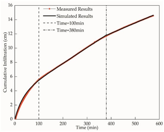 It can be seen from Figure 10 that both the calculated values and the measured values are in good agreement. The layered soil infiltration model established by superposition principle can simulate the layered soil infiltration well. That is to say, the cumulative infiltration could be divided into the flushing process and the stable infiltration process before the wetting front arrived at the interface between the two soils. The cumulative infiltration became stable, with an infiltration rate smaller than that of the homogeneous soil under the same situation.