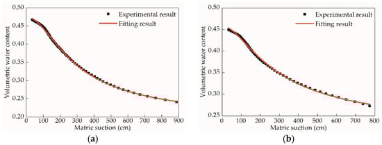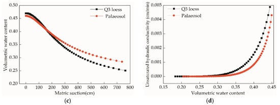 As shown in Figure 11a,b, the values of the correlation coefficient () of the fitting were 0.999 for the loess and 0.998 for the palaeosol, indicating that the laboratory results agree well with the VG model. Figure 11c indicates that the SWCCs of the loess and palaeosol intersect with each other at a suction value of approximately 155 cm, meaning that the water holding capacity of the loess layer was stronger than that of the palaeosol layer in the lower matric suction range and was weaker than that of the palaeosol layer when the matric suction was greater than 155 cm. We can see from Figure 11d that the unsaturated hydraulic conductivity of the loess and palaeosol was very low when volumetric water content was less than 0.3. The unsaturated hydraulic conductivity rapidly increased to the saturated hydraulic conductivity with the increase in volumetric water content when the volumetric water content was greater than 0.3. Furthermore, the unsaturated hydraulic conductivity of the loess was always higher than that of the palaeosol under the same volumetric water content.