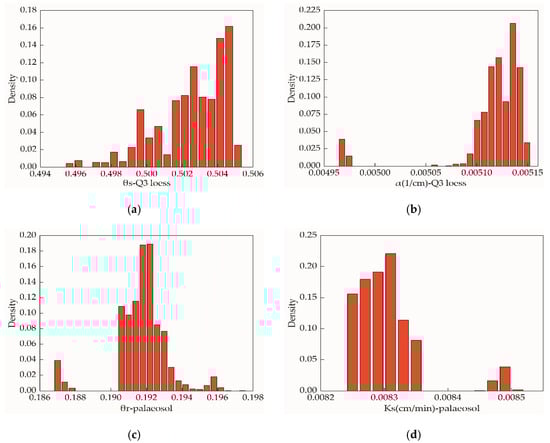 Histograms of the parameter posterior distribution derived from DREAM(zs) algorithm: (a) saturated volumetric water content of the Q3 loess (; (b) empirical parameters of the Q3 loess (); (c) residual volumetric water content of the palaeosol (); and (d) saturated hydraulic conductivity of the palaeosol (cm ).