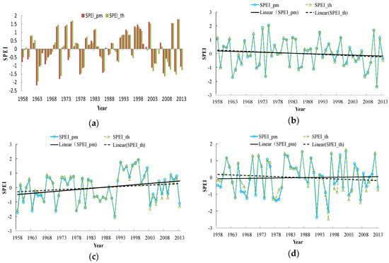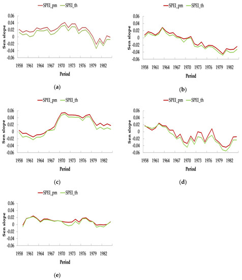 Compared with the trends of the two SPEIs during the period 1958–2013 (Table 3), there were some differences in annual SPEI_pm, annual SPEI_th, and autumn SPEI_pm during the period 1984–2013. During the period 1958–2013, the annual SPEI_pm and SPEI_th had increasing trends, while the annual SPEI_pm and SPEI_th had decreasing trends in Year1984. In autumn, the SPEI_pm had increasing trends during the period 1958–2013, but the autumn SPEI_pm had decreasing trends in Year1984. Considering that the trend of Year1984 was only the part of the variation of Sen’s slope with time within the 30-year window in the time series with a 55-year series length, therefore, the trends calculated with the 55-year series length (from 1958 to 2013) were more reasonable than the trends calculated with 30-year series length (from 1984 to 2013).