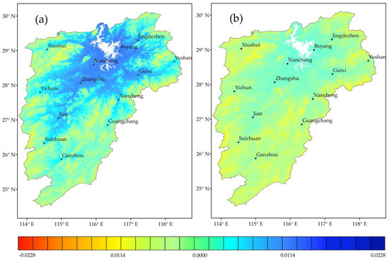 Spatial distribution of trends of annual SPEI_pm (a) and SPEI_th (b) during 1958–2013.