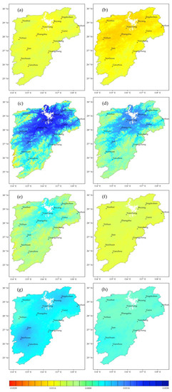 Spatial distribution of the trends of spring (a,b), summer (c,d), autumn (e,f), and winter (g,h) SPEI_pm (a,c,e,g) and SPEI_th (b,d,f,h) during 1958–2013.