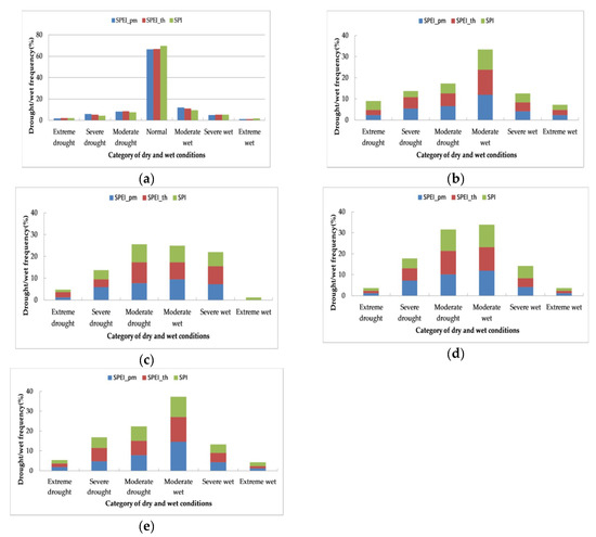 Figure 5 showed the frequency of different categories calculated from SPEI_pm and SPEI_th. As shown in Figure 5a, it can be seen that the normal class, either based on SPEI_pm or SPEI_th, had the highest occurrence, accounting for about 66%, and the frequency of extreme dry and wet classes was the lowest, less than 2.0%. The frequency of drought identified by SPEI_pm (SPEI_th) in the Poyang Lake basin was 15.5% (15.8%), of which the occurrence frequency of moderate drought, severe drought, and extreme drought were 8.1% (8.51%), 5.8% (5.37%) and 1.64% (1.94%), respectively. As for the occurrence of wet episode in the Poyang Lake basin, the frequency of wet episode identified by SPEI_pm (SPEI_th) was 18.1% (17.5%), of which the occurrence frequency of moderate wet, severe wet, and extreme wet were 11.9% (10.9%), 4.9% (5.37%) and 1.2% (1.2%), respectively.