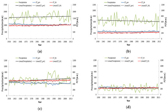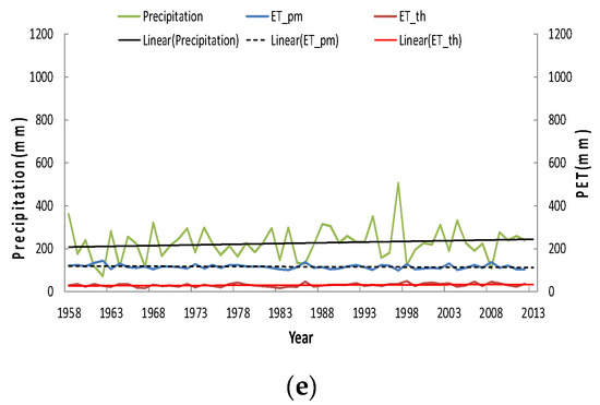 Based on the equations mentioned in Section 2.2, the accumulated values of PM-based PET (ET_pm) and TH-based PET (ET_th) on an annual scale and seasonal scales in the Poyang Lake basin from 1958 to 2013 were calculated (Figure 7). In general, ET_pm was higher than ET_th, but the difference between ET_pm and ET_th was decreasing in recent decades, except for summer, in which ET_th was higher than ET_pm, and the difference between them was increasing. After 1997, the difference between ET_pm and ET_th changed steadily. In addition, ET_pm and ET_th had opposite trends on an annual scale and seasonal scales, ET_pm had decreasing trends, while ET_th had increasing trends from 1958 to 2013, except for spring. In spring, both ET_pm and ET_th had an increasing trend.