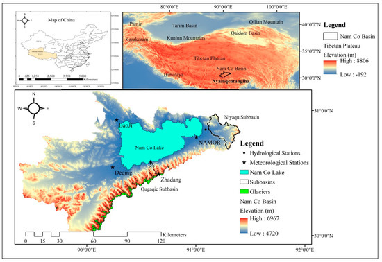 The major tributaries contributing to the lake water are situated in the western and eastern mountains while dominant glacier meltwater contribution is from the tributaries in the southern part of the lake, i.e., from the Nyainqêntanglha Mountains. Geographically, Nam Co Lake is situated at the interaction of two climatic systems, i.e., westerlies and Indian summer monsoon [32]. The average annual precipitation over the Nam Co Lake basin is about 417 mm, and monsoon (June to September) is the main rainy season. The amount of average annual precipitation (for the period of 2007 to 2013) at the NAMOR (Nam Co Station for Multisphere Observation and Research), Zhadang, Baoji, and Deqing stations is 450 mm, 499 mm, 354 mm, and 365 mm, respectively. The estimated amounts of average annual evaporations of the lake and the entire basin are about 790 mm 320 mm, respectively [33]. In the Nam Co Basin, the average annual temperature (for the period of 2007 to 2013) is about −2 to 0 °C, with a large diurnal and seasonal variability. The highest monthly temperature at the NAMOR station is about 10 °C (in July) and the lowest around −12 °C (in January). Spatial variations of the annual temperature and precipitation in the Nam Co basin are shown in Figure S1. Moreover, there are two gauged subbasins located on south and east side of the Nam Co Lake basin (Figure 1). These two subbasins have long term hydro-meteorological records and represent the topographic features of the whole Nam Co basin as discussed in our previous study [26].