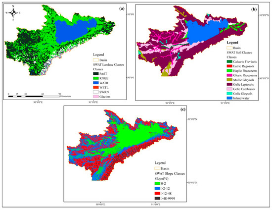Maps of (a) land use, (b) soil type, and (c) slope of the Nam Co basin.