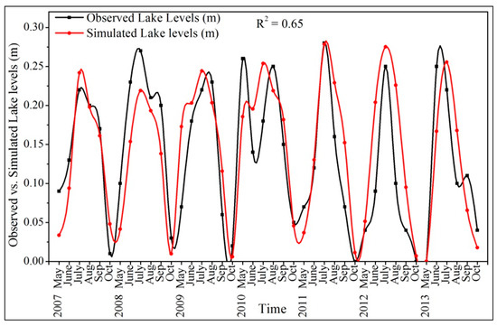The basin-wide performance of the SWAT model was assessed with reference to the observed Nam Co Lake levels for the period of 2007 to 2013. Performance of the simulated streamflows was assessed using Nash–Sutcliffe efficiency (NSE), Percent Bias (PBIAS) [59], and Coefficient of Determination indices (. The equations of these metrics are
