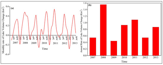 (a) Monthly and (b) annual rate of change of the Nam Co Lake volume from 2007–2013.