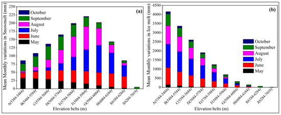 Figure 6b displayed the temporal variations of glacier melt at different elevation belts of the Nam Co basin. It was found that from May to October glacier melt decreased from low (elevation of 5384–5484 m) to high (elevation of 6284–7019 m) elevation belts of the Nam Co basin due to high temperature at low elevation. Overall, the highest amount of glacier melt was found in July and the lowest was in May. The amount of ice melt at mid-altitude (i.e., 5884–5984 m) was less than that of snowmelt, which was highest at mid-altitude. On the other hand, snow and ice melt was nearly zero at the highest altitude zone, which is known as the accumulation zone.