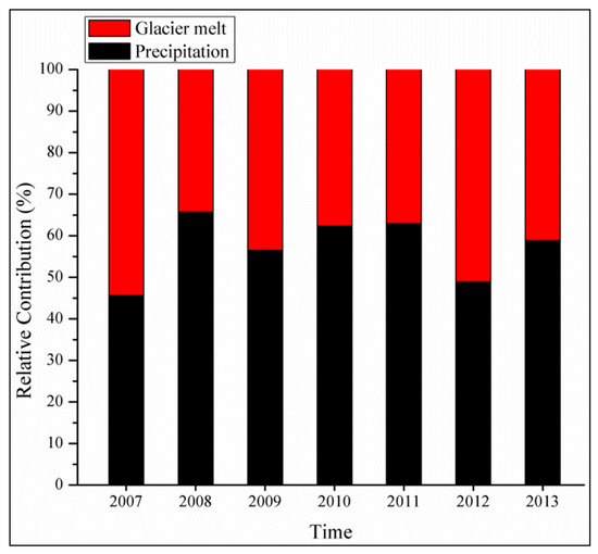 Figure 7 showed that the annual contributions of precipitation and glacier melt to the Nam Co Lake fluctuated between 45 to 65% and 34 to 54%, respectively, for the period of 2007 to 2013. It was observed that major contributor of streamflows to the Nam Co Lake was precipitation in 2008 to 2011 and 2013; while in 2007 and 2012 glacier melt contribution to the lake was found significant as compared to precipitation. Overall, the average annual proportional contribution of precipitation and glacier melt to Nam Co Lake was 57% (or 667 mm), and 43% (or 502 mm), respectively. The results revealed that precipitation was the main cause of the expansion of the Nam Co Lake, followed by glacier melt and decreased lake evaporation. Further analysis unveiled that the mean total amount of water generated during the summer season in the glaciated and non-glaciated subbasins flowing into the Nam Co Lake was 74% and 26%, respectively. However, the number of glaciated and non-glaciated subbasins in the Nam Co basin was 17 and 13, respectively. Therefore, due to the fact of a large number of glaciated subbasins and combined input of glacier melt and precipitation from the glaciated subbasins, the amount of water flowing into the Nam Co Lake was more than that of non-glaciated subbasins.
