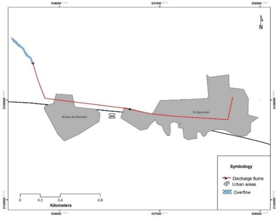 “S” effluent (Figure 6) transports the wastewater produced by two settlements of 15,000 and 3150 inhabitants [24], and discharges into a non-operational wastewater treatment plant, and as final disposal site, land.