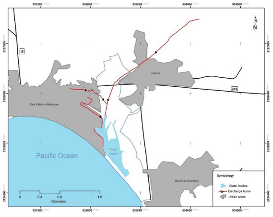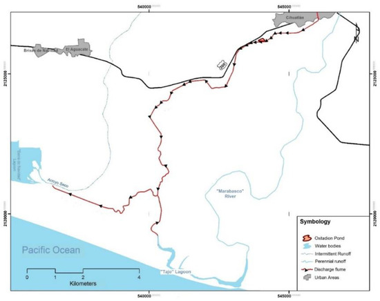 “J” effluent (Figure 4) catches the urban wastewater produced by two settlements of 15,000 and 3200 inhabitants [24] and discharges without any treatment directly into a coastal lagoon.
