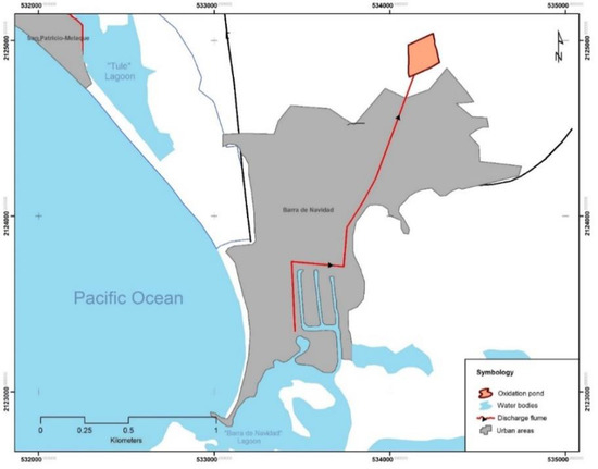 “L” effluent (Figure 5) transports the wastewater produced by a settlement of 4320 inhabitants [24] and discharges into an overloaded oxidation pond as a final disposal site.