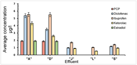 From the water samples analyses, it was possible to identify the presence of the envisioned ECs. In the next graph (Figure 8) are presented the average concentrations in the five studied effluents.