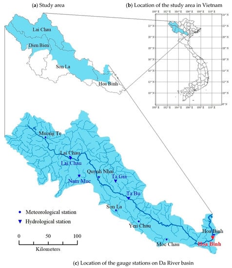 Location of the study area and the gauge stations. (a) Description of Da River basin in provinces of Vietnam; (b) Description of provinces in Vietnam; (c) Description of location of gauge stations on the Da River basin.