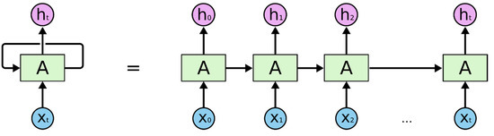 The recurrent neural network was first developed in the 1980s [30,31,32]. Its structure consists of an input layer, one or more hidden layers, and an output layer. RNNs have chain-like structures of repeating modules with the idea behind using these modules as a memory to store important information from previous processing steps. Unlike feedforward neural networks, RNNs include a feedback loop that allows the neural network to accept a sequence of inputs. This means the output from step t − 1 is fed back into the network to influence the outcome of step t, and for each subsequent step. Therefore, RNNs have been successful in learning sequences. Figure 3 shows the sequential processing in RNN.
