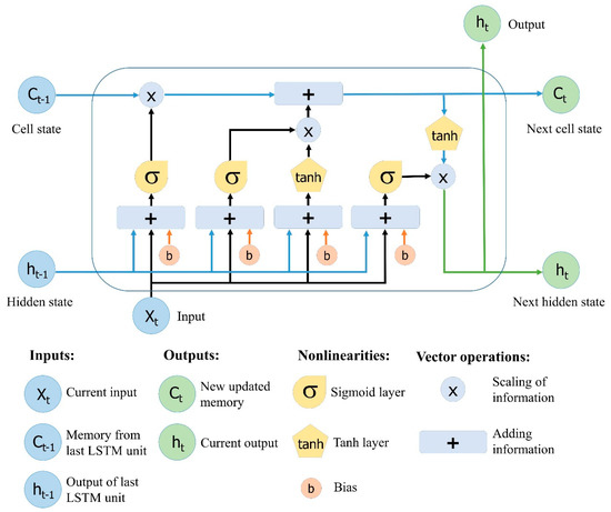 Here, Ct−1 and Ct are the cell states at time t − 1 and t, while W and b are the weight matrices and bias, respectively, of the cell state.