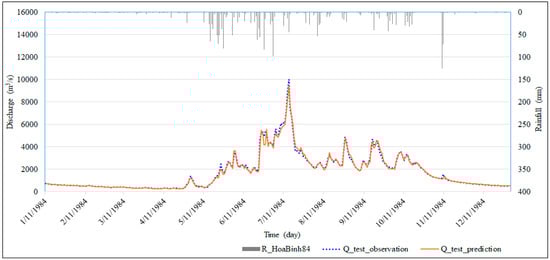 Two scenarios of forecasting models were tested on data not used for training and validation with the purpose to objectively verify the performance of the model and the accuracy of the model when forecasting the flood peak. We chose the flood peak in the year 1984 to test the model with the series of the test dataset, which was observed daily in 1984 from 1 January to 31 December. During this period, the highest peak flood at the Hoa Binh Station was recorded on 15 July with a measured flowrate of 10,000 m3/s. The performance of the models was determined using the NSE and RMSE metrics when comparisons between the measured data and forecasted values were made.