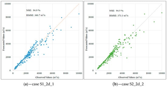 Figure 5 and Figure 6 demonstrate a close correlation between the observed and predicted values for forecasting one day of lead time for each scenario. There are essentially no significant differences between the predicted cases. Figure 5 illustrates how the rainfall influences the forecasted flowrate result due to the rain causing the flood flow. Rain peak usually occurs first followed by the flood peak; the lag time depends on the basin’s characteristics. Figure 6 provides information regarding the graphical performance indicator when the data pairs are close to the 45° line. Data pairs closest to the 45° line represent better prediction cases. The NSE value is almost unchanged in both scenarios (about 99%). A similar trend was witnessed in the case of a two-day and three-day forecast.