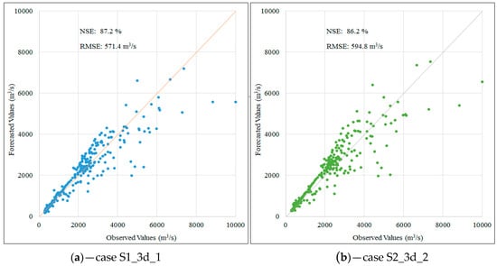 The results of the testing process and prediction of flood peak for the two scenarios are summarized in the Table 5. Additionally, Figure 7, Figure 8, Figure 9 and Figure 10 illustrate the correlation between the observed and predicted values in the two scenarios for three forecast cases.