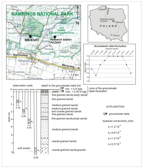 - Fic, M.; Wierzbicki, A. Organizacja sieci monitoringu wód podziemnych na terenie rezerwatu ”Pożary” w Kampinoskim Parku Narodowym. Geol. Surv. 1994, 42, 1004–1008. (In Polish) [Google Scholar]