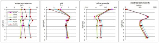 The ORP varied between −28 and +109 mV, depending on the season and sampling depth. The lowest values occurred at 2.10 m bgs, indicating slightly reducing conditions (from −28 to 60 mV), probably due to the influence of the microbial decomposition of organic matter in the peat layer. In the deeper parts of the aquifer, positive values of redox potential were observed (from 14 to 109 mV), indicating a mildly reducing environment.