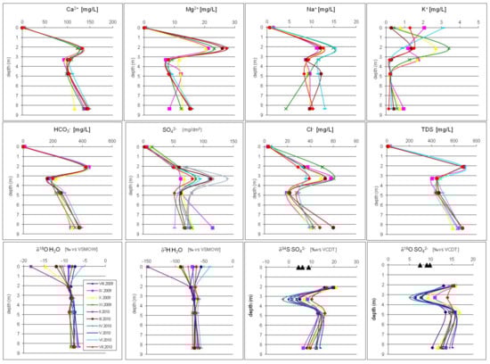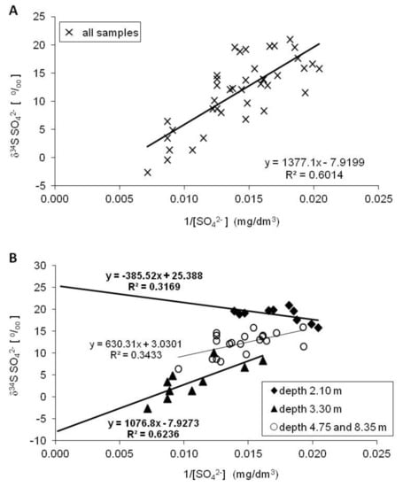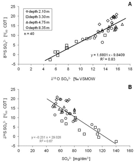 Based on these relationships, the enrichment factors (ε) for sulfur and oxygen were estimated to be −18.8‰ and −9.0‰, respectively (Figure 10). On the other hand, the logarithmic regressions for the mean values (from the entire observation period) of sulfate concentrations and isotopic compositions at particular depths yielded much better correlation factors (R2), higher than 0.9. The estimated enrichment factors for sulfur and oxygen were −28.9‰ and −14.7‰, respectively (Figure 10). The estimated values of the enrichment factors yield ε34S/ε18O ratios of about 2.0, which is in quite good agreement with the obtained slope of the δ34S vs δ18O enrichment around 1.7 (Figure 9).