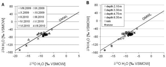 The δ2H vs. δ18O relationship in groundwater of the Pożary aquifer. Differentiation of isotopic composition is shown for sampling seasons (A) and depth profile (B). Global Meteoric Water Line (GMWL) after [47]: δ2H = 8.13 × δ18O + 10.8.