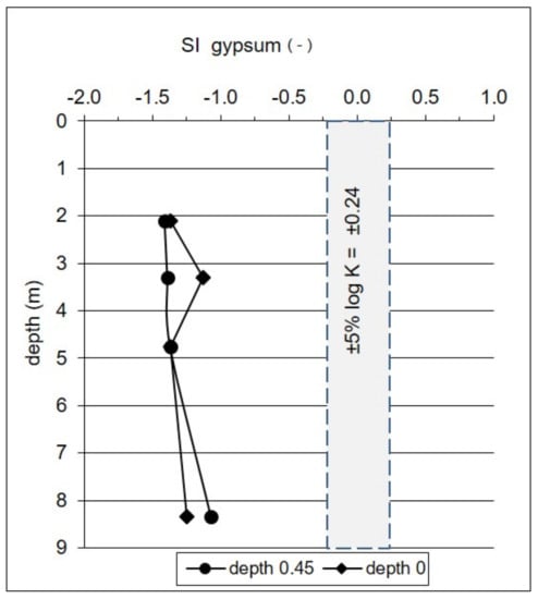 Sulfates in the analyzed groundwater may also be derived from soluble minerals such as gypsum (CaSO4·2H2O or anhydrite CaSO4), which is a common sulfate mineral in freshwater peatland. Similar to pyrite, gypsum is mostly authigenic, and may constitute a considerable source of sulfate dissolved in groundwater affected by peatland [53]. Saturation indices calculated based on our data show undersaturation with respect to gypsum, and the potential dissolution of gypsum along the whole vertical profile of the aquifer, regardless of the hydrogeochemical conditions (Figure 7).