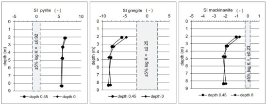 Numerous studies have shown that pyrite (FeS2) is a commonly occurring species of RIS in freshwater peatlands, while greigite (Fe3S4) and mackinawite (FeS0.9) are minor components of the RIS pool [1,5,6,57,58]. Two genetic types of pyrite have been identified in peat bogs, namely syngenetic and epigenetic [6,59,60,61]. Syngenetic pyrite is formed in anoxic environments during bacterial sulfate reduction (Ssulfate → Spyrite), mainly as framboidal pyrite and more rarely as euhedral pyrite. Epigenetic pyrite is produced during the humification of peat, when sulfur from sulphobacteria and carbon from plant respiration bond and are reduced to sulfidic sulfur (Sorganic → Spyrite). Berner and Raiswell [62] suggested a greigite (Fe3S4) precursor for framboidal pyrite (FeS2) and amorphous FeS and a mackinawite precursor for euhedral pyrite. Framboidal pyrite (i.e., mostly syngenetic) is clearly the most abundant species of RIS in peat deposits, and was found, for example, in peatland of the Lubartowska Upland, Western Poland [53]. Moreover, Jóźwiak [63] indicated the possibility of the precipitation of pyrite from the groundwater of selected peatland of the Kampinos National Park. According to Berner and Raiswell [62], at the Pożary research station, hydrogeochemical conditions in the aquifer are favorable to the formation of framboidal as well as euhedral pyrite. SIs calculated based on our data show supersaturation with respect to pyrite and the potential possibility of its formation along the entire profile of the aquifer (Figure 8). On the other hand, the negative values of SIs for greigite and mackinawite show that these compounds are not stable and undergo dissolution.