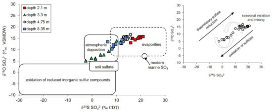 Stable isotopes of O and S are used first of all to investigate the sulfate sources, the sulfate reduction and oxidation zones in the peat, and to compare sulfate sources in various wetland systems often located in different hydrogeological and climatic conditions [4,5,7,14]. Isotopic composition of sulfates is also used to explain the mechanisms and sources of SO42− released from peatlands to streams, lakes, or soils [11,13,14].