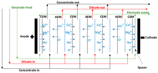 Desalination of alternative waters, such as brackish water, seawater, municipal, and industrial wastewater, has become a critical strategy to expand traditional water supplies and to alleviate water shortages [1]. Electrodialysis (ED) is a membrane desalination technology that uses semi-permeable ion-exchange membranes (IEMs) to selectively separate salt ions in water under the influence of an electric field [2]. An ED stack consists of pairs of anion-exchange membranes (AEMs) and cation-exchange membranes (CEMs) arranged alternatingly between an anode and a cathode (Figure 1). The positively charged cations migrate toward the cathode, pass the negatively charged CEM, and are rejected by the positively charged AEM. The opposite occurs when the negatively charged anions migrate toward the anode. This results in an alternatively increasing ion concentration in one compartment (concentrate) and decreasing salt concentration in the other (diluate). The process can be viewed as a dialysis process, where the ion diffusion across the membranes is amplified and orientated by an electric field. Electrodialysis reversal (EDR) is a modified ED process, where the electrical polarity of the electrodes is reversed periodically. This results in a reversal in the direction of the ion transport so that the concentrated stream becomes the diluate stream and vice versa. This self-flushing of scale forming ions and fouling matter in concentrate compartments allows EDR to operate at a higher water recovery than ED.