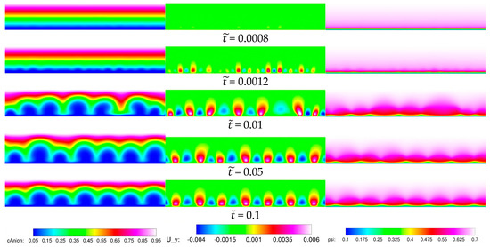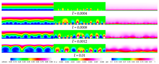 As two representative cases for the baseline ( NaCl concentration) 2-D simulations, in Figure 5 and Figure 6, instantaneous visualizations of the anion concentration, vertical velocity, and electric potential are shown for dimensionless voltages of = 30 and 40. Initially, at = 0.0008 for = 30 and = 0.0004 for = 40, the solutions are very close to the 1-D initial condition. However, the vertical velocity iso-contours reveal that disturbances are growing as a result of the EKI. The instability sets in earlier for the higher voltage. Once the disturbance amplitude is above a certain threshold, periodic structures can be discerned above the membrane. The structures are also seen in the anion concentration but less so in the electrical potential. As time progresses, the disturbances are growing and for = 0.01 (= 30) and 0.0008 ( = 40) they are strong enough to result in a significant distortion of the electrical potential. The merging of neighboring structures results in the formation of larger structures such as seen for the last two time instances for = 40.
