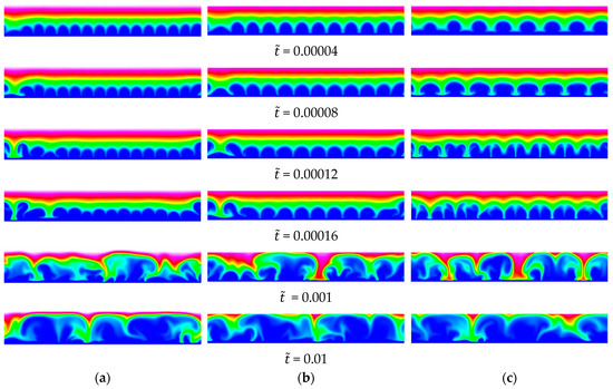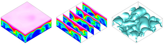 The NaCl concentration was raised to and (simulating slightly and moderately brackish water), and finally (seawater). For the medium and high concentration cases, the grid extent was decreased by a factor of 10 in all directions. Since the number of cells was kept constant, this resulted in a factor of 10 increase of the grid resolution and the electric field strength. As the concentration was increased, the structures appeared earlier and their size was reduced. The same mesh dimensions ( were employed for the 1 and simulations (Figure 5, Figure 6 and Figure 7 and Figure 12a). For the latter, the initial structures were much smaller and appeared earlier. Similar observations can be made for the 100 and 400 concentration cases, which were both computed on a mesh (Figure 12b,c). This suggests that the onset of the instability is also (in addition to the voltage) dependent on the ion concentration and that the wavelength of the most unstable disturbances scales with the concentration.