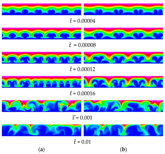 The main emphasis of the present investigation is on the effect of surface roughness on the current density. According to Rubinstein and Zaltzman [8], by making the membrane surface wavy, the initial wavelength of the disturbances can be controlled. All simulations with wavy membrane are for the baseline case with a concentration. It was decided to first try a membrane waviness with an amplitude of and a wavelength of . Iso-contours of the anion concentration for a dimensionless voltage of = 120 are shown in Figure 13. Compared to the smooth membrane results in Figure 7, the structures form much earlier and up to = 0.00016 have a pronounced periodicity that is dictated by the wall waviness. Especially for = 0.00012 and 0.00016, the structures are mushroom-shaped and similar in appearance to the structures resulting from buoyancy-driven instability. For , the initial periodicity is lost and the flow is more chaotic.
