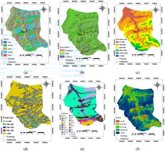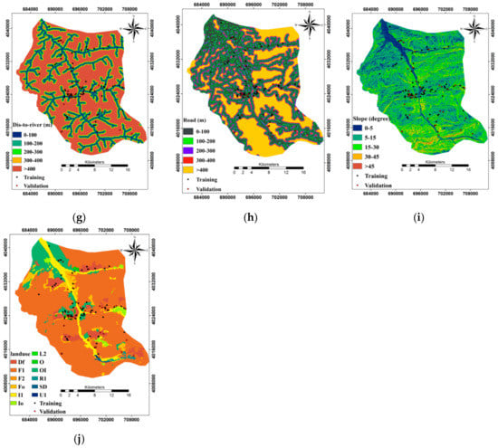 (a) Slope aspect, (b) curvature, (c) elevation, (d) distance from the fault, (e) lithology, (f) NDVI, (g) distance from the river, (h) distance from the road, (i) the slope angle, and (j) land use.
