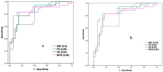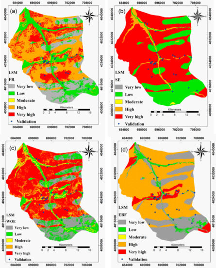 The area under the curve of the success rate for the FR, SE, WoE, and EBF models was 0.85, 0.84, 0.86, and 0.8, respectively (Figure 6a). Further, the area under the curve of the prediction rate for the FR, SE, WoE, and EBF models was 0.83, 0.82, 0.84, and 0.79, respectively (Figure 6b). The AUC amount of 0.84 for the WoE shows 84% prediction accuracy of the model. Considering the results of the evaluation by the AUC, the most accurate prediction in the identification of LSM is for the WoE model and the least accurate prediction is for the EBF. However, generally, prediction accuracies of these four models are reasonable.