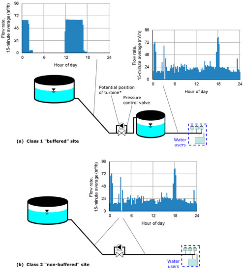 Class 1 sites are generally intermediate (such as break-pressure tanks (BPTs)) or terminal storage tanks with pressure control valves [6], typically located within the water “transmission” section of the water supply chain [13]. In the authors’ experience and estimation, class 1 sites are common and represent a relatively cost-effective opportunity for renewable energy generation. They offer the water supplier flexibility (positively correlated with storage volume) in determining the rate, duration and timing of tank filling (and thus turbine operation), as this must not necessarily occur simultaneously with the downstream use in the supply zone (see Figure 1). Assuming that the inflow rate is not restricted (e.g., by the naturally occurring, seasonally varying flow from a mountain spring), the inflow regime can often be freely adjusted to maximize energy generation through a turbine, regardless of how it was managed in the past [12].