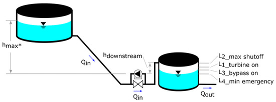where Qbypass is the chosen bypass flow rate, Qturbine is the chosen turbine flow rate, L2_max shutoff is the maximum permissible tank water level (% of full), L1_turbine on is the threshold tank level at which the turbine is operated, L3_bypass on is the threshold tank level at which the bypass pipe is opened, and the turbine pipe is closed. A further value, L4_min emergency, signifies the lowest permissible water level. If Ltank falls short of this, the Qturbine is excluded from the set of feasible solutions. See Figure 2 for a visual representation of these tank levels. For the method to properly function, the following relationships between values must be true (Equations (10a) and (10b)):