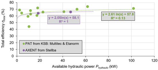 To provide the tool user with the calculated electrical energy generation, it is necessary to estimate the total efficiency, which is a product of the efficiency of the turbine (hydraulic to mechanical energy) and efficiency of the generator (mechanical to electrical energy). To make the tool as appealing as possible to practicing engineers, the authors chose to use data from two microturbines that are currently on the market: the in-line axial “AXENT” turbine from Stellba Hydro [35] and pumps-as-turbines (PAT) from KSB [36], companies with whom the authors have worked previously. The total efficiency ηtotal at the hydraulic best efficiency point for turbines of varying capacities was plotted relative to Phydraulic, leading to Figure 3. For each type, AXENT and PAT (two separate models), natural log curves were fitted to the data to generate equations that enabled the estimation of ηtotal based on the input of Phydraulic (Equations (12a) and (12b)). The tool can be updated with new data for other types of turbines from other companies, although this cannot currently be easily done by a normal user.
