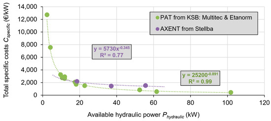 Equations (14a) and (14b) show the specific cost function for each turbine type. The shape of these curves corresponds approximately to data compiled from turbine projects in Switzerland [1]. The total specific costs Cspecific are calculated by entering Phydraulic into Equations (14a) and (14b), and the total costs Ctotal for a given site and turbine are obtained by multiplying Phydraulic with Cspecific.